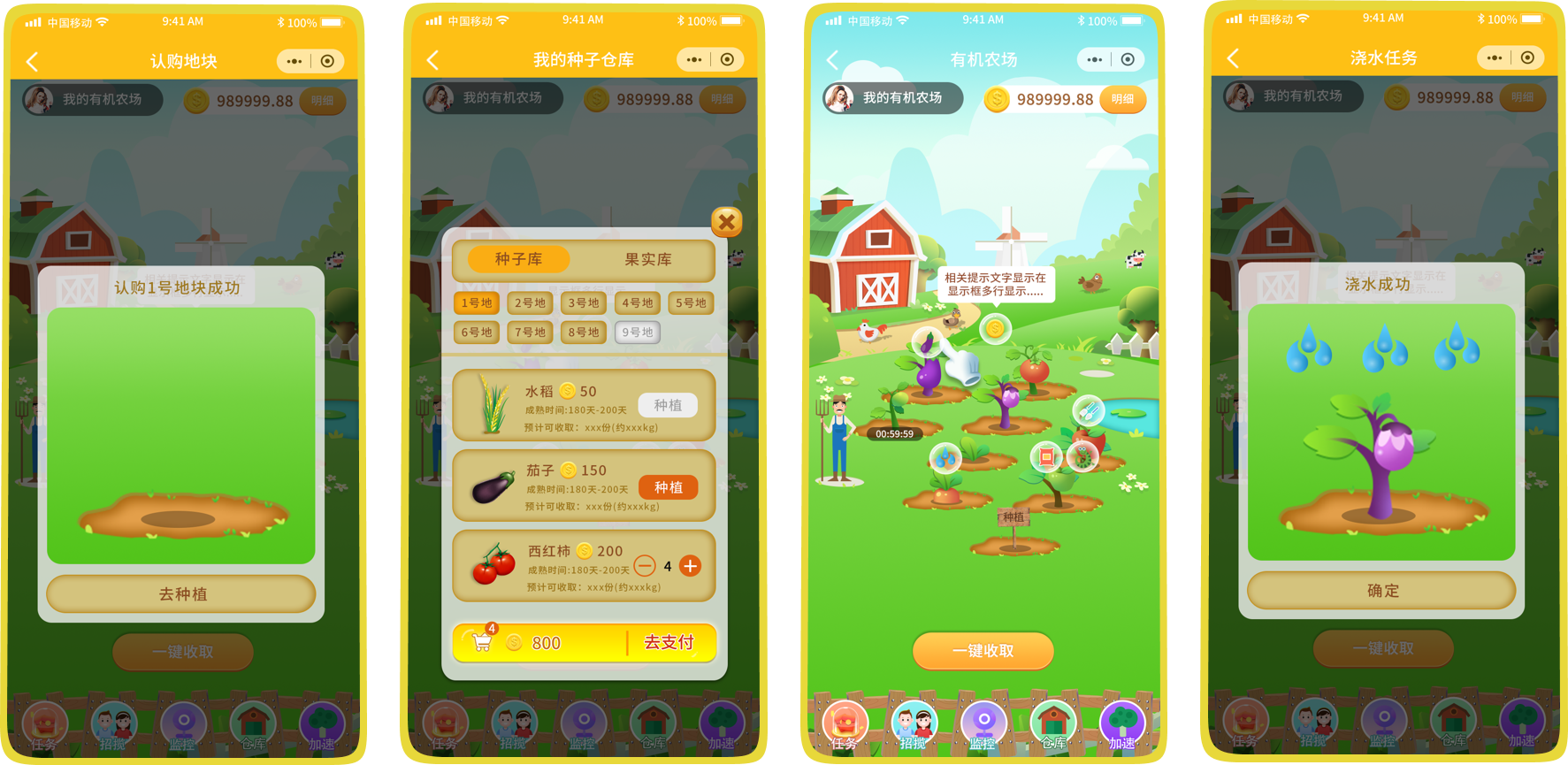 作物成熟后一键采摘收获,产出对应农产品;收获产物可存入仓库,领取果实快递配送或者到店自提。
