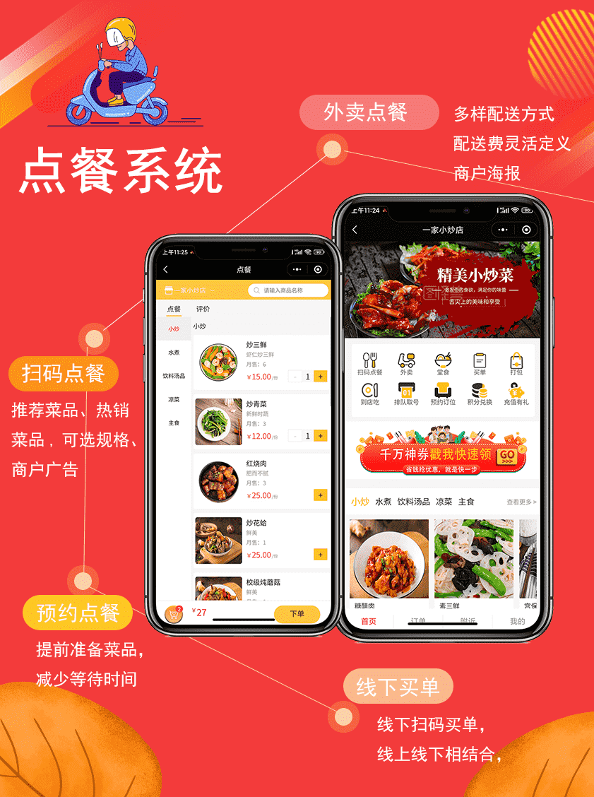 以用户用餐生命周期角度出发,用餐预约取号、包间订座、扫码点餐、外卖叫餐、商家配送跑腿等一系列交互行为,小程序系统帮你一并解决,解决商家烦恼。