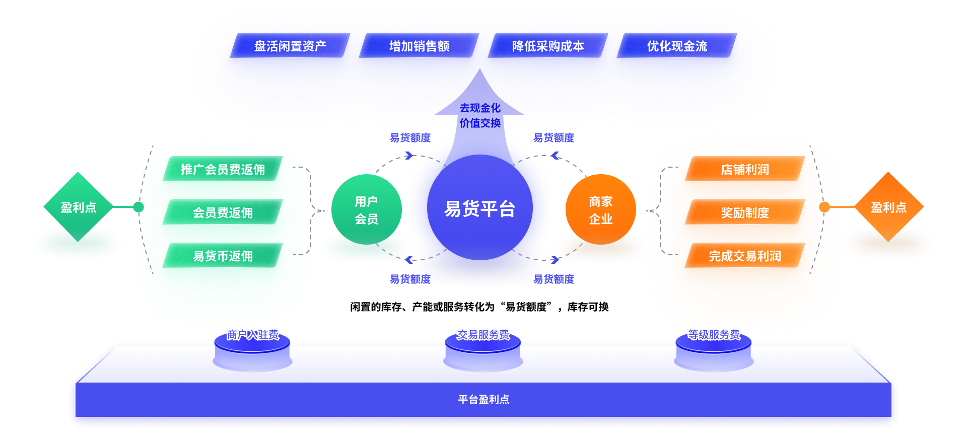 易货商户享有不同的年费制度、入驻服务费制度、会员奖励制度、交易服务费制度、名额制度、税点制度、赠送权益等…
