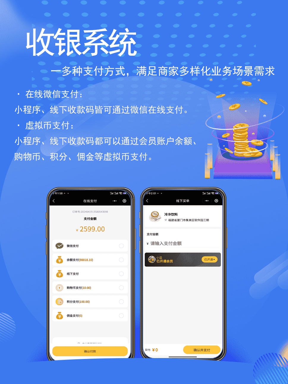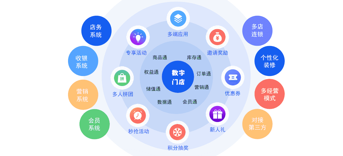 支持多店模式,融合门店系统产品的营销优势,实现了多门店间会员、活动、商品等多方位线上线下的打通。