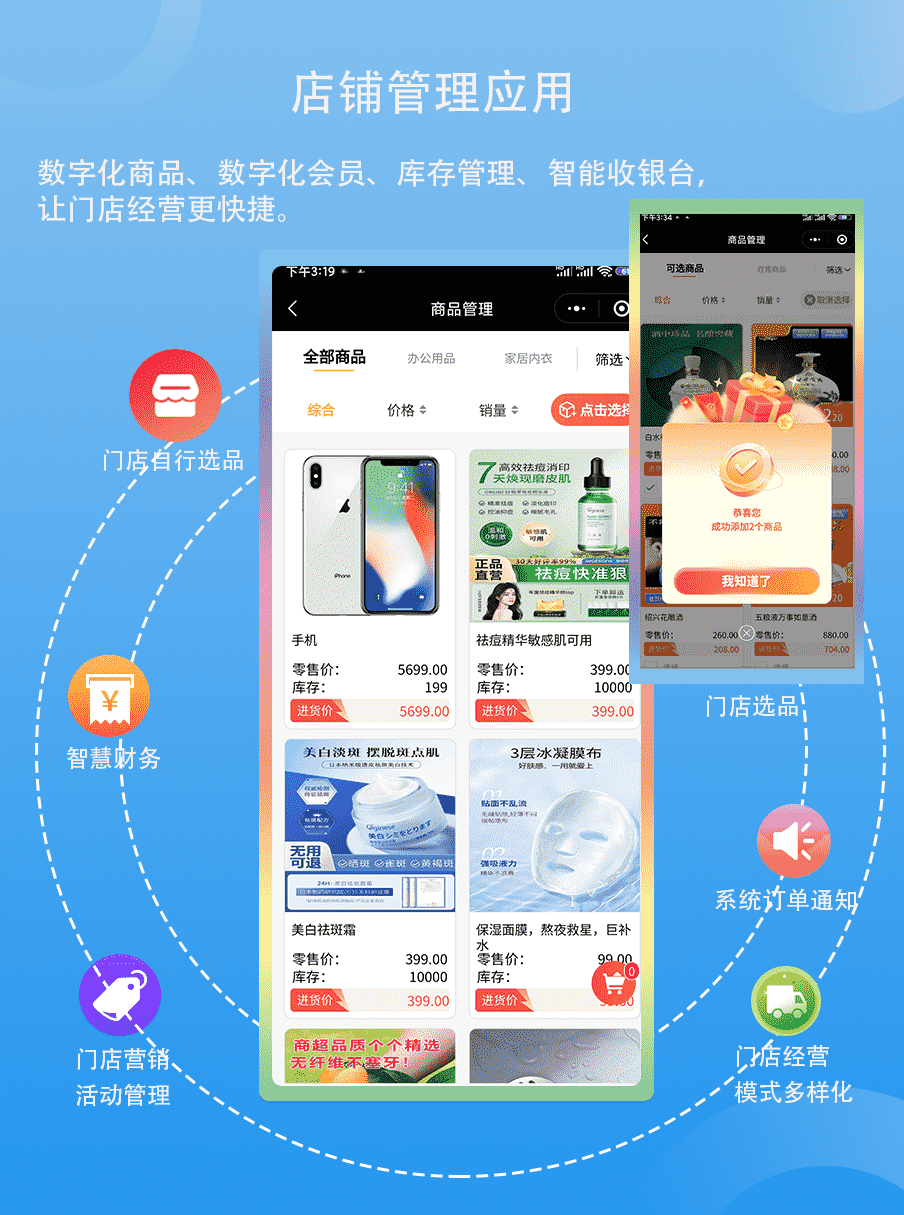 门店选品模式、门店自行上架商品模式、多种经营模式并存运营。