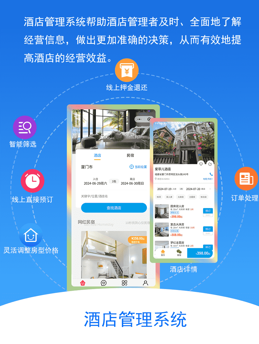 轻松处理订单、一键入住、快速退房轻松完成续住与结账