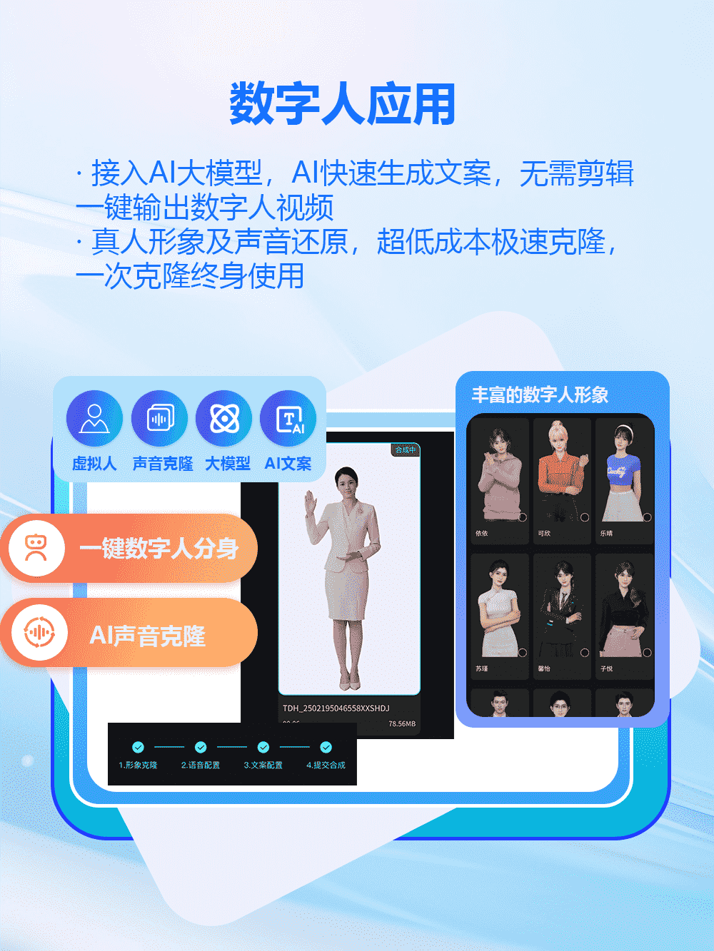 快速录制视频,制作1:1真人虚拟数字分身分身通过输入文本即可AI驱动生成虚拟人视频替代真人出镜满足多场景应用需求,高效便捷
